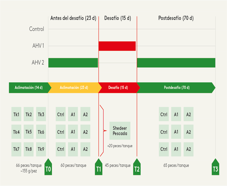 AHV1 recibió un pulso durante 15 días a 2.5 kg/t alimento, desde que los peces troyanos fueron añadidos a los estanques. AHV2 recibió dos pulsos, uno predesafío de 23 días y otro postdesafío de 45 días, ambos a 2.5 kg/t alimento. Los salmones Atlánticos (S. salar) fueron mantenidos en agua de mar (30-33 psu) a temperaturas de 11.6°C a 15.1°C, con aireación/oxigenación constante para mantener una saturación de oxígeno de ~9.8 mg/L. Al finalizar el periodo predesafío, los peces fueron pesados y medidos para análisis de patógenos (qPCR e IFAT). Para el desafío por cohabitación, cada pez troyano fue inoculado con 0.2 mL de P. salmonis (genogrupo EM-90) a 9.67×10⁷ ufc/mL. Se colocaron 20 peces troyanos por estanque y se muestrearon 10 peces cohabitantes para análisis. La mortalidad se registró diariamente y se realizaron necropsias desde la aclimatación hasta el fin del desafío. La alimentación se ajustó para asegurar un máximo de 10% de sobrealimentación. La mortalidad se registró durante 60 días postdesafío.
