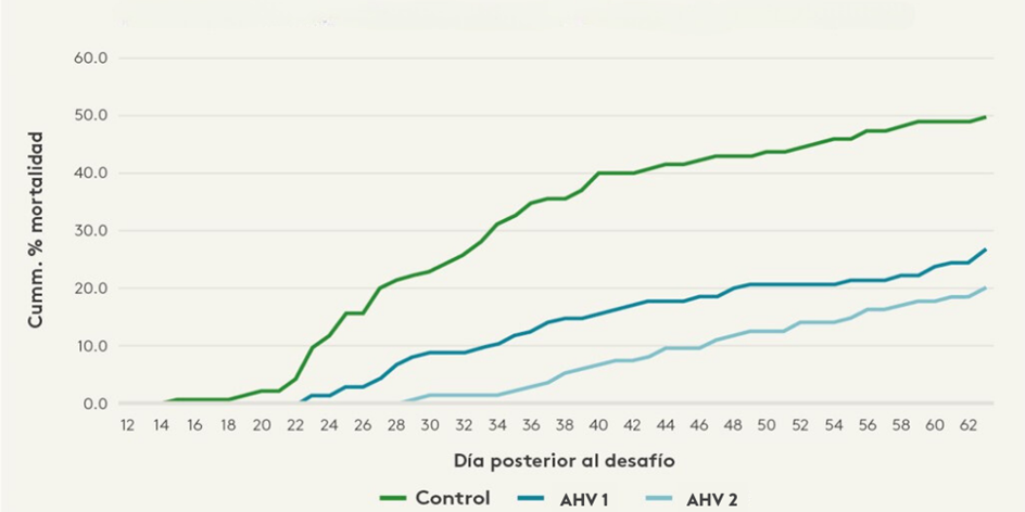 Figure 2 Mortalidad acumulada posterior al desafío por cohabitación con peces troyanos infectados con P. salmonis para los grupos tratados con PreHarvest (AHV1 y AHV2) y el grupo control.