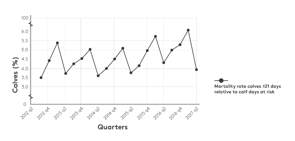 Figura 3: Mortalidad postnatal de terneros ≤21 días en rebaños lecheros holandeses por trimestre del año desde el 1 de julio de 2012 hasta el 30 de junio de 2017, según 2 denominadores diferentes para el cálculo de la mortalidad de terneros. (Santman-Berends, 2019)