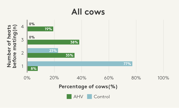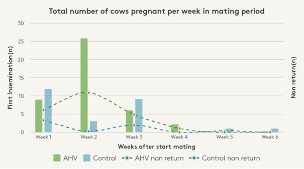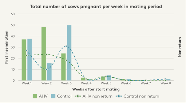 Este rebaño comenzó el apareamiento el 11 de octubre. 85/109 (78%) vacas AHV quedaron preñadas en las dos primeras semanas de celo frente a 52/102 (51%) de las vacas control. Esto significa más leche en esta lactación y un patrón de parto más compacto para la próxima temporada.