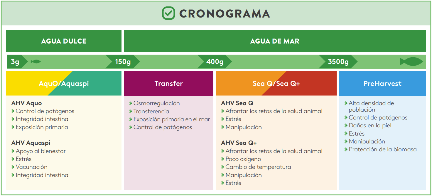 Cada fase del cultivo presenta desafíos únicos: desde el desarrollo temprano en agua dulce, pasando por la transferencia, hasta la etapa final en mar. Con AHV Salmo Aquo, Aquaspi, Transfer, Sea Q, Sea Q+ y PreHarvest, ofrecemos un programa integral que fortalece defensas naturales, optimiza la nutrición y contribuye al bienestar de los peces en los momentos más críticos.