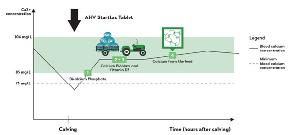 At AHV, all products and programs are aimed at supporting the cow, but ultimately empowering it to tackle the challenge itself. Therefore, administering a high dose of calcium without stimulating calcium metabolism does not fit with our philosophy. In the graph below, you can see that a cow enters a calcium dip immediately after calving. To overcome this dip, AHV StartLac Tablet ensures that there is readily available calcium, magnesium and phosphorus.