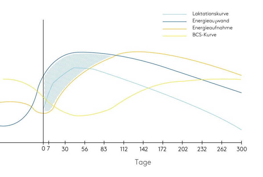 Wenn man die Bedürfnisse der Kuh kennt, kann man die Herausforderungen proaktiv angehen. Jede hochleistende Kuh hat mit einer negativen Energiebilanz zu kämpfen. Der Energiebedarf ist durch die hohe Milchleistung höher als die Energieaufnahme (Abbildung 2). Durch Energiemangel wird die Leberfunktion dauerhaft reduziert und wiederkehrende Herausforderungen werden in den ersten 60 Tagen der Laktation auftauchen.