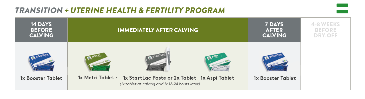 Das AHV Transitprogramm konzentriert sich, wie oben beschrieben, auf die Zeit vor und nach dem Abkalben, stellt ausreichend Energie und Mineralstoffe zur Verfügung und regt die Trockenmasseaufnahme an. Dieses Programm knüpft perfekt an das AHV Gebärmuttergesundheitsprogramm an, um Kühe welche frisch gekalbt haben vollständig zu unterstützen und ihnen zu ermöglichen, den produktiven Zyklus optimal wieder aufzunehmen.