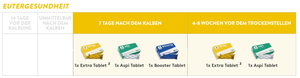 Zur optimalen Unterstützung der Laktation empfiehlt das AHV Programm Eutergesundheit die Verabreichung der AHV Extra Tablet in Verbindung mit der AHV Aspi Tablet und der AHV Booster Tablet am Tag 7 nach dem Kalben. Darüber hinaus wird eine zweite Runde von Extra Tablet und Aspi Tablet 4-8 Wochen vor dem Trockenstellen empfohlen.