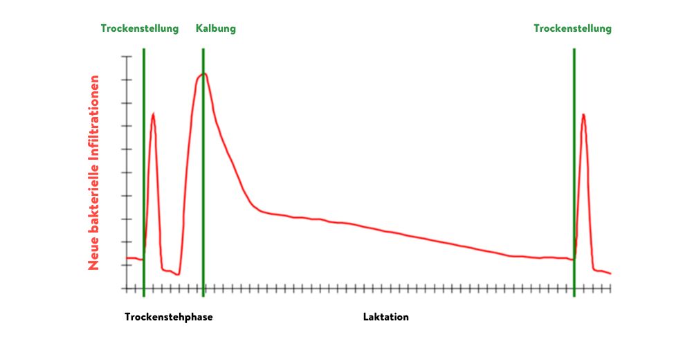 In den letzten Jahren ist der Druck auf Milchviehhalter in Bezug auf das Trockenstellen gestiegen. Durch genetische Selektion, Fütterung und das allgemeines Herdenmanagement konnten höhere Milchleistungen erzielt werden. Dies hat jedoch auch dazu geführt, dass das Abmelken am Ende der Laktation schwieriger geworden ist. Die Trockenstehphase ist entscheidend für eine optimale Milchleistung und Eutergesundheit in der folgenden Laktation. Während dieser Zeit besteht für Kühe ein erhöhtes Risiko, neue (Euter-) Infektionen zu entwickeln (Abbildung 1), insbesondere zu Beginn der Trockenstehphase (Vilar & Rajala-Schultz, 2020).