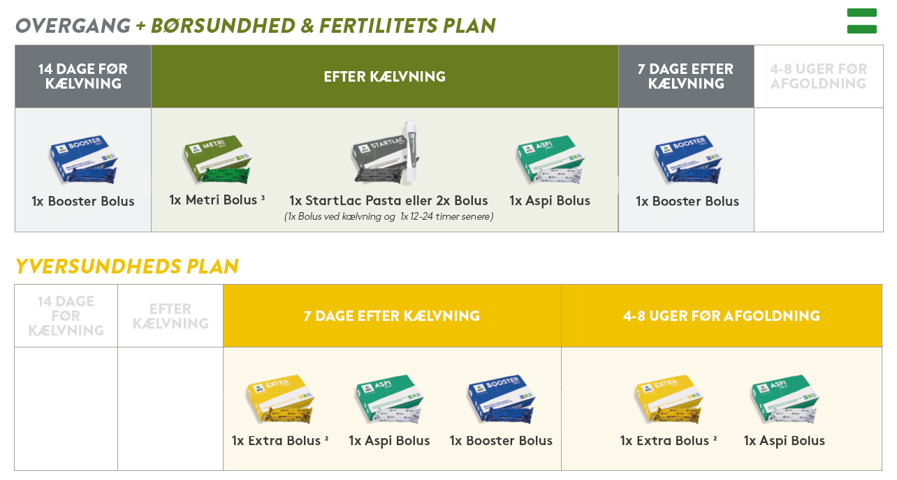 Den aktive AHV Energy & Metabolisme Plan består af to aktive kategorier, NRG-L (Proaktiv) og NRG-A (Aktiv) (se figur 2). Booster-produkter kan også aktivt bruges, når der opstår helbredsproblemer, for at give koen hurtigt tilgængelig energi. AHV Booster Powder kan bruges som en drench. For at gøre dette blandes 1 kilo Booster Powder med 20 liter lunken vand og eventuelt 500 ml Aspi. Denne væskebehandling aktiverer vommen og fremmer fyldning heraf. Det giver også et øjeblikkeligt energiboost og hydrering. Hvis drenching ikke er en mulighed, kan der anvendes to Booster Paste.