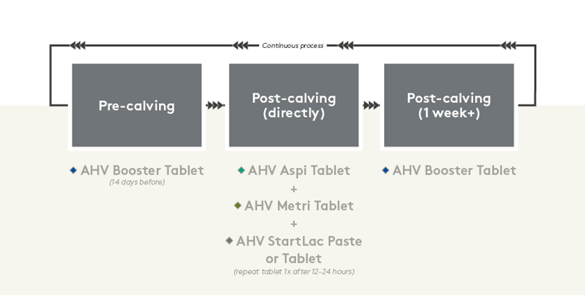 Udover D-vitamin indeholder StartLac Pasta også vitamin B3, som understøtter immunsystemet, (energi)stofskiftet og leverfunktionen. Både vitaminerne og mineralerne i StartLac-produktionen er til stede som aktive, letoptagelige komponenter. De skal derfor ikke omdannes i dyret først, og giver dermed øjeblikkelig støtte af dyret. For at sikre den bedste start på laktationen har AHV designet AHV Metri Tablet. Den støtter koen direkte efter kælvning ved at forbedre hygiejnen i børen og stimulere afgangen af efterbyrden. På den måde opnås optimal børsundhed så hurtigt som muligt. Desuden indeholder Metri Tablet vitamin B3, som understøtter immunsystemet. Efter kælvning går der også meget energi til vævsreparation. Især højt ydende køer har brug for flere mineraler og energi til dette, end lavt ydende køer. Også kvier har brug for større mængder energi for at komme sig. AHV Booster-produkterne giver mulighed for at støtte køernes energi balance, gennem let optagelig dextrose og laktose, og at give en stabil vom- og blod-pH gennem bufferen af natriumbicarbonat. Denne buffer er meget vigtig, da køer begynder at æde og drøvtygge mindre omkring kælvning. På grund af det lavere foderoptag bliver vomvæggene mere følsomme. Natriumhydrogencarbonatet fungere som vombuffer, og sørger for at pH-værdien stabiliseres. For optimale resultater og en hurtigere genopretningsproces anbefales det at støtte med AHV Aspi. Aspi understøtter vævets blodgennemstrømning, understøtter immunsystemet i restitutionsperioder og fremmer dyrenes generelle velbefindende. Cirka 70 % af de sundhedsmæssige udfordringer, en malkeko kan stå over for i sin levetid, sker i denne overgangsperiode. Derfor er der lavet en masse behandlings planer for denne periode. Men på grund af stigende antimikrobiel resistens kan effektiviteten af disse planer være nedsat (Lhermie et al., 2018). Det er grunden til, at AHV er stolte af at tilbyde nye løsninger på gamle problemer med den ekstra fordel af ingen tilbageholdelsestid og intet krav om at adskille dyr i forbindelse med brug af AHV produkter. Hvis køerne har en optimal sundhed i overgangsperioden, er der større sandsynlighed for, at de er produktive og har en succesfuld laktation efterfølgende. Når kosundheden optimeres år efter år, bliver køerne mere rentable og bliver længere i besætningen.