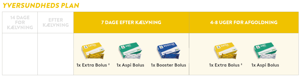 For optimal laktationsstøtte anbefales det, i Yversundheds programmet, at tildele AHV Extra Tablet sammen med AHV Aspi Tablet og AHV Booster Tablet på dag 7 efter kælvning. Ydermere anbefales en anden omgang Extra Tablet og Aspi Tablet 4-8 uger før afgoldning.