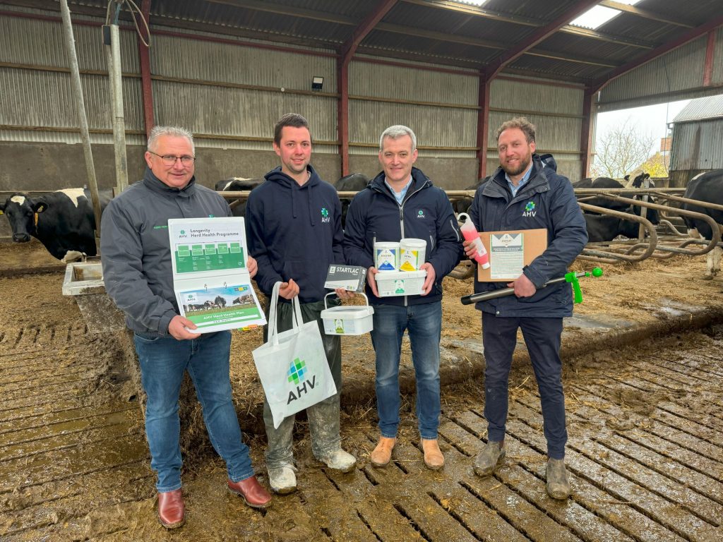 Pictured left to right: Paul Marrs AHV Animal Health and Longevity Manager UK & Ireland, Andrew Sayers, Adam Robinson AHV Managing Director UK & Ireland and James Warnock, AHV Tyrone Area Consultant.