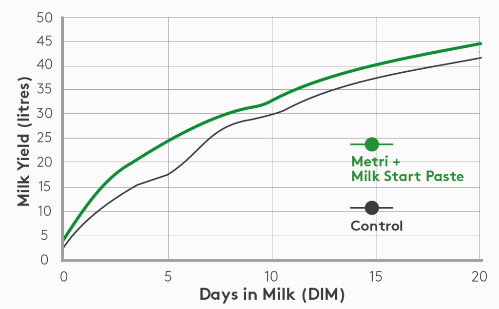 Metri Tablet + Milk Start Paste, immediately after calving. Please note since this trial was conducted, AHV StartLac Paste was introduced as a reformulated and improved version of Milk Start Paste.