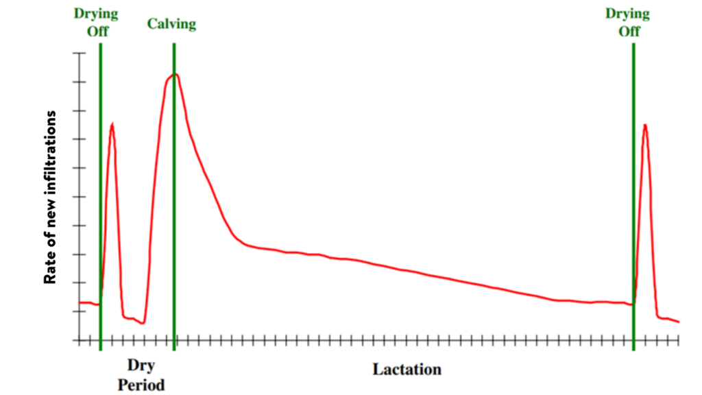 Figura 1. Ilustración esquemática de la tasa de nuevas infiltraciones intramamarias durante el ciclo de lactancia. El pico en la tasa de nuevas infiltraciones, después del secado, es considerablemente mayor en las vacas que no reciben ninguna forma de terapia de vaca seca (Bradley y Green, 2004).