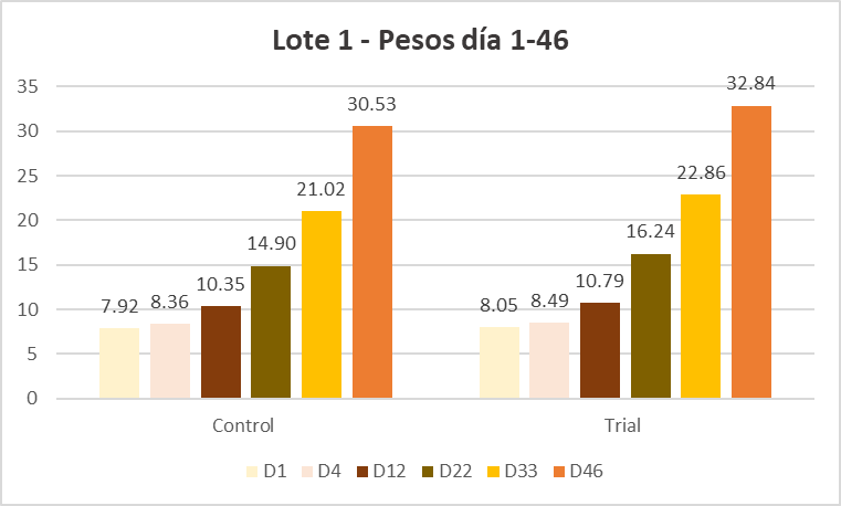 Tabla 1. Resultados de peso en el grupo de control y de prueba lote 1.