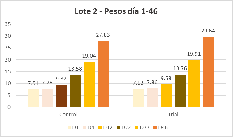 Tabla 2. Resultados de peso en el grupo de control y de prueba lote 2.