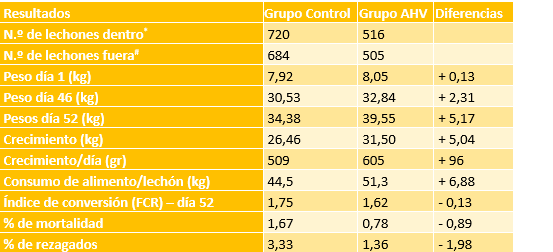 Tabla 3. Resumen de resultados entre control, grupo de ensayo AHV y diferencias. *Medido a los 28 días de edad, en el día 52 después de la colocación en el corral de lechones.