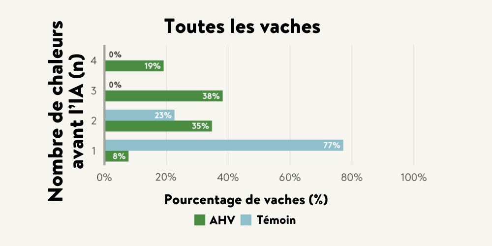 • 57% des vaches du groupe AHV ont eu 3 ou 4 chaleurs visibles avant la période d’insémination contre 0% pour le groupe témoin (Max 2 chaleurs).