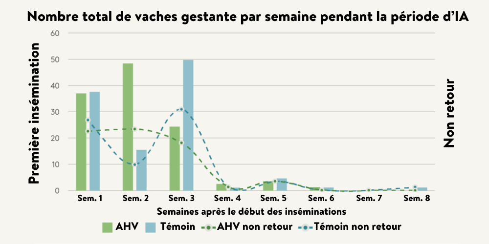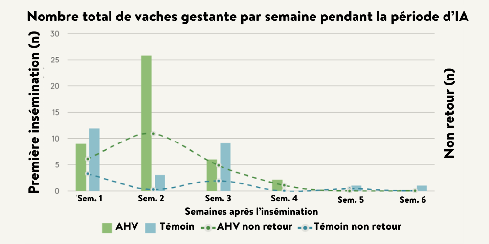La figure 3 montre le nombre total de vaches gestantes par semaine, pendant la période des inséminations, ainsi que le nombre de vache ne revenant pas en chaleur (pour celles ayant vêlées tardivement). Le taux de vaches vides était de 24% pour le groupe AHV contre 35% pour le groupe Témoin.