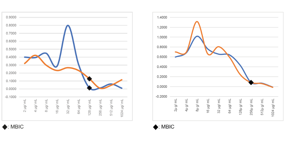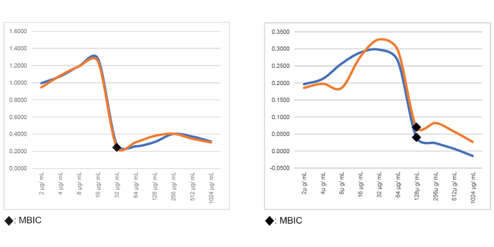 AHV’s patented QQ components are tested by the RTI lab on bacteria selected from cows from the field with udder health issues on the prevention of biofilm formation. All the selected bacteria from the field showed the ability to produce biofilm. AHV’s patented QQ compound is tested in duplo (blue and orange line), on gram positive and gram negative bacteria on the effectiveness to prevent biofilm formation (figure 2 up to 5).