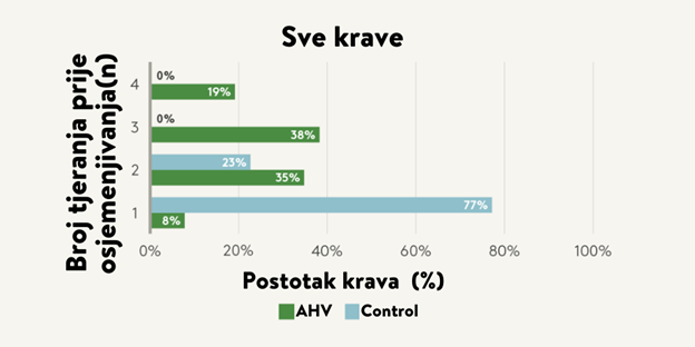Slika 1 pokazuje da je 57% mliječnih krava u AHV testnoj skupini imalo 3 ili 4 tjeranja prije osjemenjivanja u odnosu na 0% za krave kontrolne skupine.