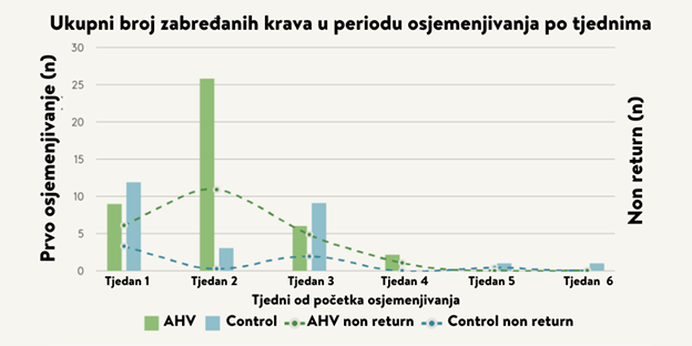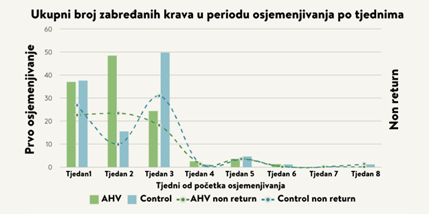 Vrlo je bitno napomenuti da se iz AHV testne skupine, samo 7,8% krava se nije počelo tjerati prije osjemenjivanja. Dok kod kontrolne skupine, čak 76,6% krava nije pokazivalo znakove tjeranja prije osjemenjivanja. Ne treba zaboraviti da krave koje uđu u redovni ciklus i pravovremeno ostaju gravidne, često daju više mlijeka u sljedećoj laktaciji.