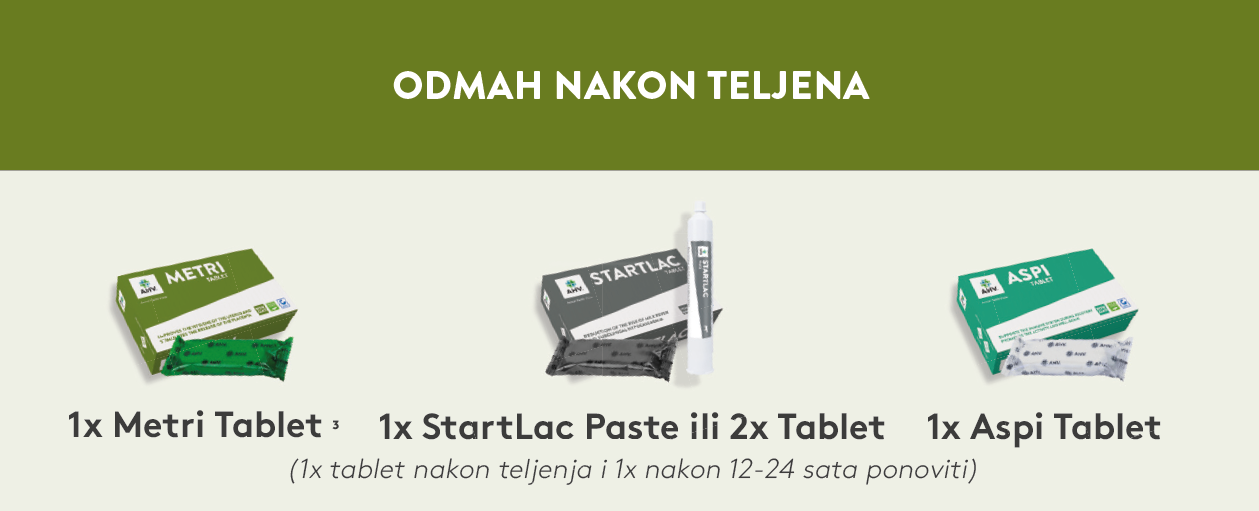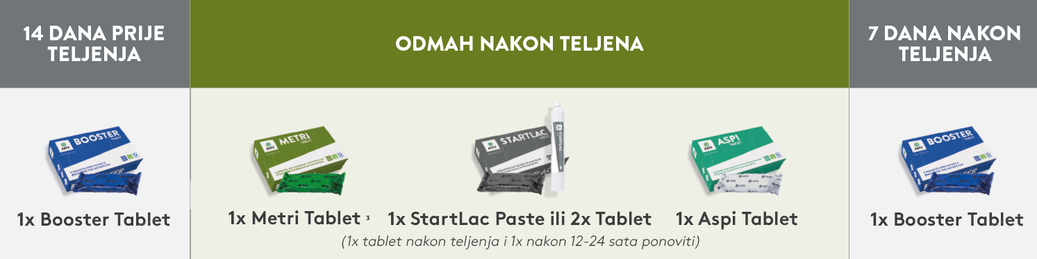 Ovaj program uključuje AHV Metri Tablet, StartLac Paste (ili StartLac Tablet) i Aspi Tablet. Zajedno ovi proizvodi podržavaju oporavak maternice nakon teljenja, pripremaju kravu za sljedeći graviditet i odličan početak laktacije.