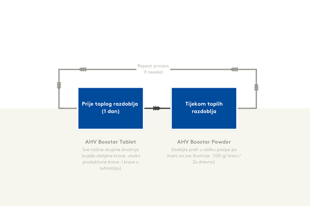 U AHV-u vjerujemo da je najbolje proaktivno podržati životinje u različito vrijeme njezina ciklusa. Stoga preporučamo upotrebu naših Booster proizvoda u vrijeme očekivanog toplinskog stresa. Osigurajte Booster Tablet visokorizičnim životinjama dan prije toplijeg razdoblja kako biste unaprijed stavili energiju na raspolaganje i potaknuli veći unos hrane. AHV Booster Tablet optimizira energetsku ravnotežu aktiviranjem metabolizma krave (jetre i buraga). Pomoći će jetri da spriječi razgradnju masti. Posebno za visokorizične skupine životinja kao što su svježe oteljene krave, visokobređe krave i krave u suhostaju, ova potpora je iznimno važna.