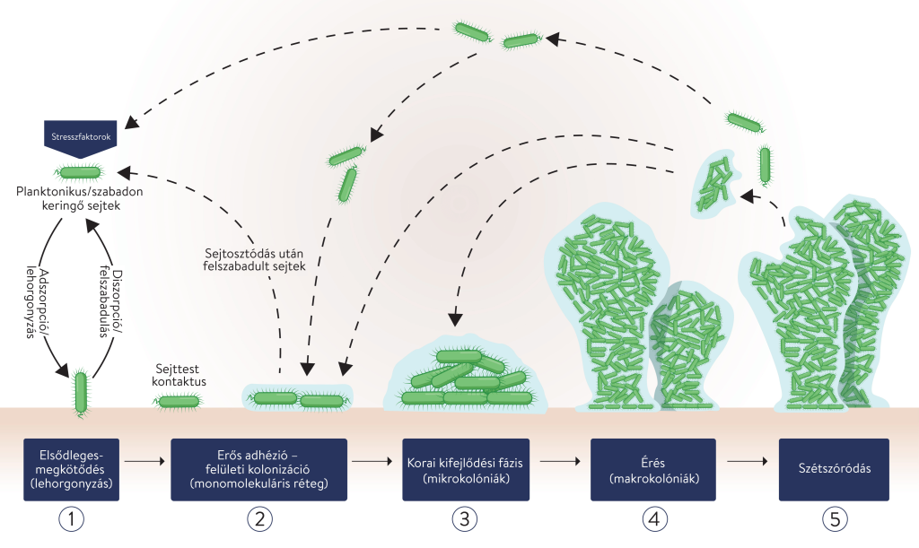 ábra: A baktérium biofilmképződésének sematikus ábrázolása szilárd felületen (AHV International, Guzmán-Soto et al., 2021 alapján).