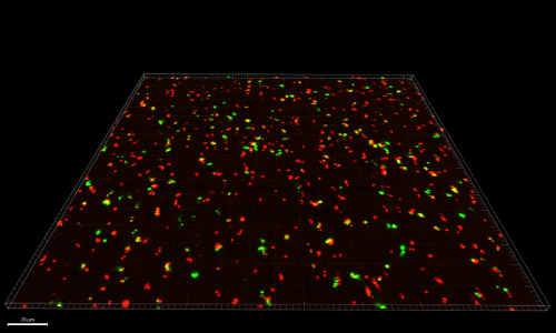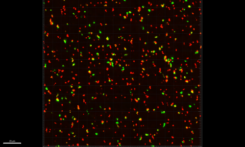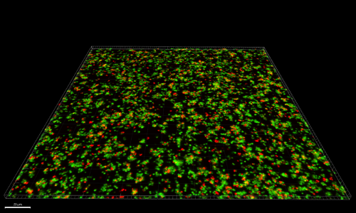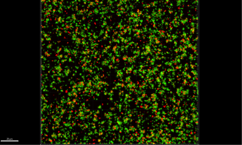 Bacterial biofilm visualized from the top in a Nikon confocal laser scanning microscope. Green signals represent the living bacteria, red signals represent inactive bacteria. The top panel resembles the control with untreated biofilm. The bottom panel shows biofilm treated with patented AHV QSI Technology extracts. The results of the core AHV QSI Technology were measured after one day (figure 3). A clear reduction / breakdown of the biofilm was already established because of a high amount of inactive bacteria and a few living bacteria.