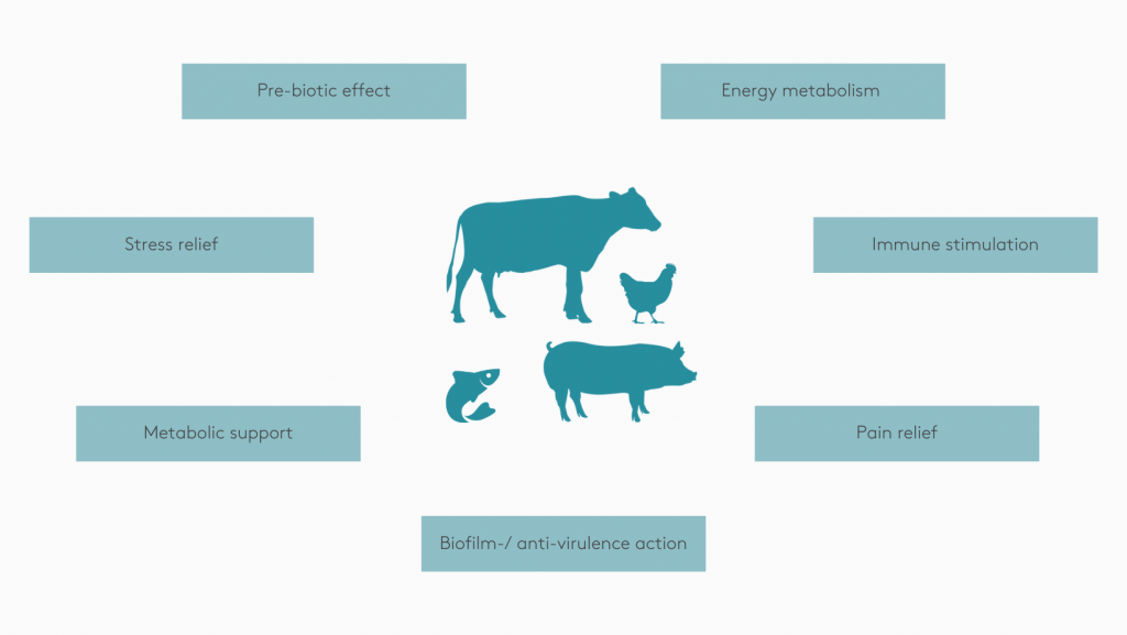 Our patented AHV QSI Technology extract inhibits bacterial communication, avoids biofilm formation and reduces virulency. Our products promote the (natural) immune system of the body cells and support the animals’ energy and mineral metabolism.