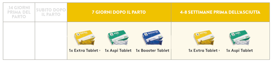 Per un supporto ottimale alla lattazione, Il programma salute uterina raccomanda la somministrazione di AHV Extra Tablet insieme ad AHV Aspi Tablet e AHV Booster Tablet il 7° giorno dopo il parto. Inoltre, si consiglia un secondo ciclo di boli Extra e Aspi 4-8 settimane prima dell’asciutta.