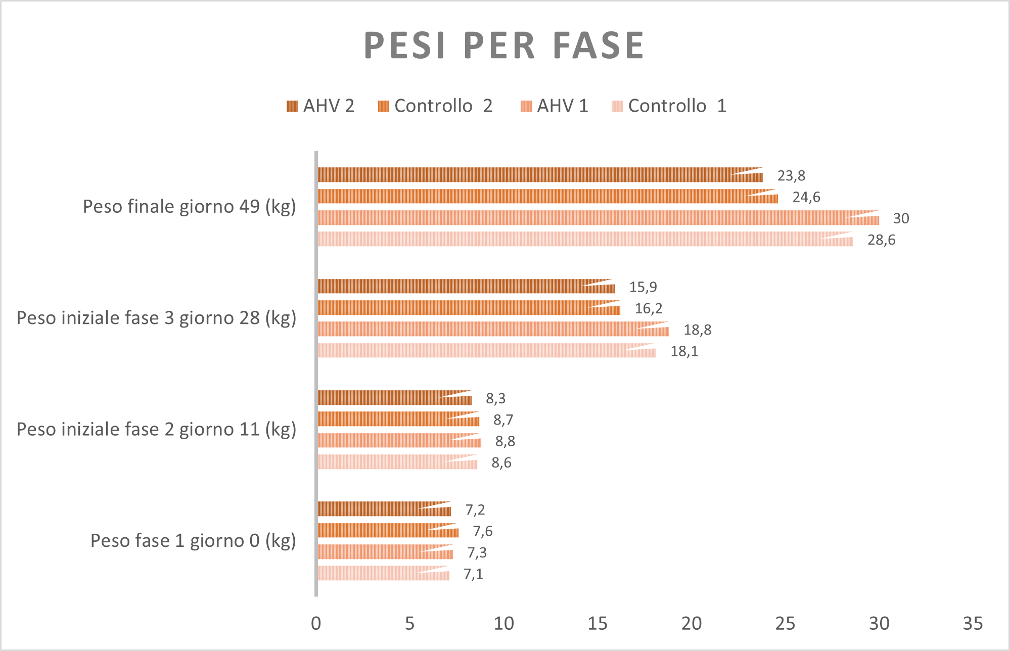 Grafico 1. Pesi per fase nei due gruppi di Controllo e nei due gruppi di Test AHV.