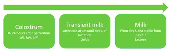 Il colostro e il latte differiscono nei tempi di secrezione e nella composizione. Il colostro è la prima secrezione delle ghiandole mammarie che si forma in gran parte prima del parto. Il colostro è caratterizzato da più alte concentrazioni di immunoglobuline (Ig) rispetto al latte, mentre il latte è ricco di grassi e lattosio (Decaluwé et al., 2014). Inoltre, il colostro e il latte sono ricchi di vari composti bioattivi come stimolatori della crescita (EGF, IGF) ed enzimi (lipasi, amilasi), molti dei quali sono importanti per la sopravvivenza e promuovono lo sviluppo gastro-intestinale e l’assorbimento delle sostanze nutritive (Mei et al., 2006). Le secrezioni mammarie cambiano gradualmente nel tempo (vedi immagine).