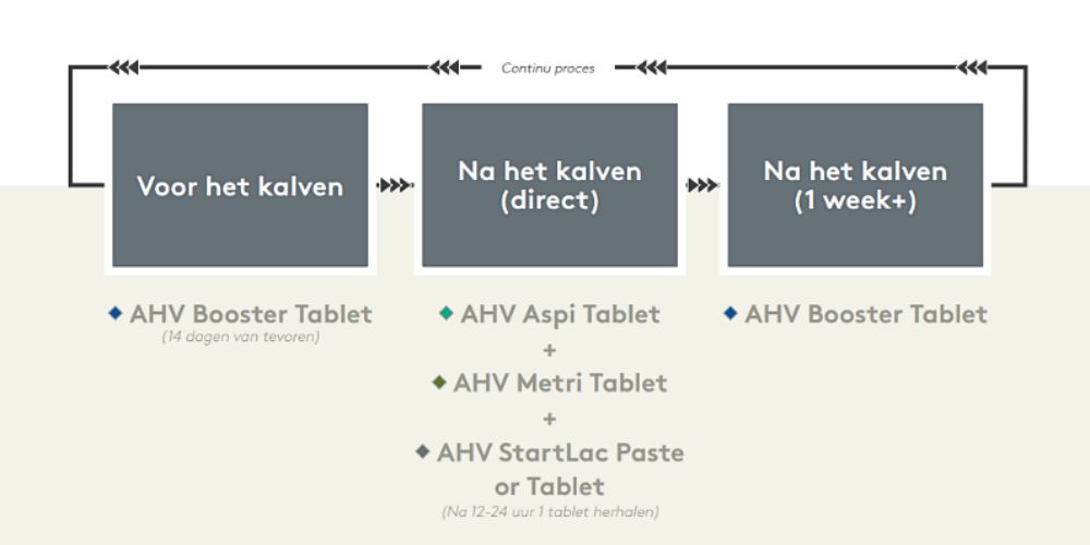 Het AHV Transitie Programma, zoals hierboven besproken, richt zich op de periode voor en na het afkalven, het verstrekken van voldoende energie en mineralen en het stimuleren van de droge stof opname. Dit programma sluit perfect aan op het AHV Baarmoedergezondheid Programma om de pas afgekalfde koeien volledig te ondersteunen en haar de productieve cyclus optimaal te laten hervatten.