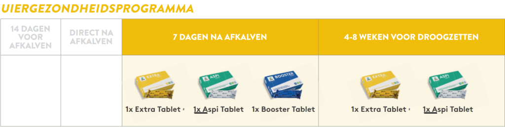 Bij AHV geloven we dat de beste aanpak is om dieren proactief te ondersteunen in verschillende stadia van haar cyclus. In lijn hiermee adviseren we om 14 dagen voor het afkalven proactief een Booster Tablet toe te dienen en dit 7 dagen na het afkalven te herhalen. Dit ondersteunt onder andere de baarmoedergezondheid, vruchtbaarheid en uiergezondheid. De AHV Booster Tablet zorgt ervoor dat de koe weer gaat en blijft vreten, waardoor de energiebalans wordt geoptimaliseerd en de stofwisseling (lever en pens) van de koe wordt geactiveerd.