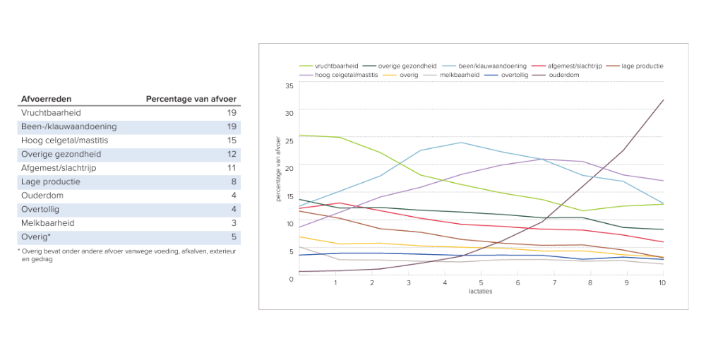 Ondanks dit potentieel haalt zo’n 70% van de Nederlandse koeien de vierde lactatie niet. Zo publiceerde CRV recentelijk nog een rapport over voornaamste afvoerredenen van koeien. Zoals ook te zien in de tabel en figuur hieronder. De belangrijkste redenen voor afvoer? Slechte uiergezondheid, verminderde vruchtbaarheid en kreupelheid.