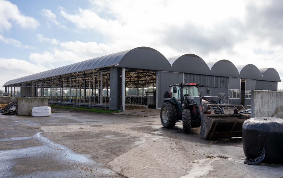 Groot is het contrast tussen lage, witte historische hoeve en de hoge serrestal erachter. “Nog maar twee jaar geleden molken we met een Canadees bindsysteem. We hebben een behoorlijke sprong in de tijd genomen”, vertelt melkveehouderij Dominiek Martens op zijn melkveebedrijf in Oostkamp. Na het middageten stappen tientallen koeien op het gemakje de nieuwe serrestal uit. Anders dan de meeste boeren koos de boer bij zijn nieuwbouw voor een vrijloopstal. “Daarmee kunnen de koeien hun natuurlijk gedrag volgen en bij een ligboxenstal is het maar afwachten hoe ze reageren”, aldus Martens die voor de potstal ter inspiratie een aantal keer naar Nederland reed. Ook voor de bouw van de serrestal stak hij zijn licht op collega’s.