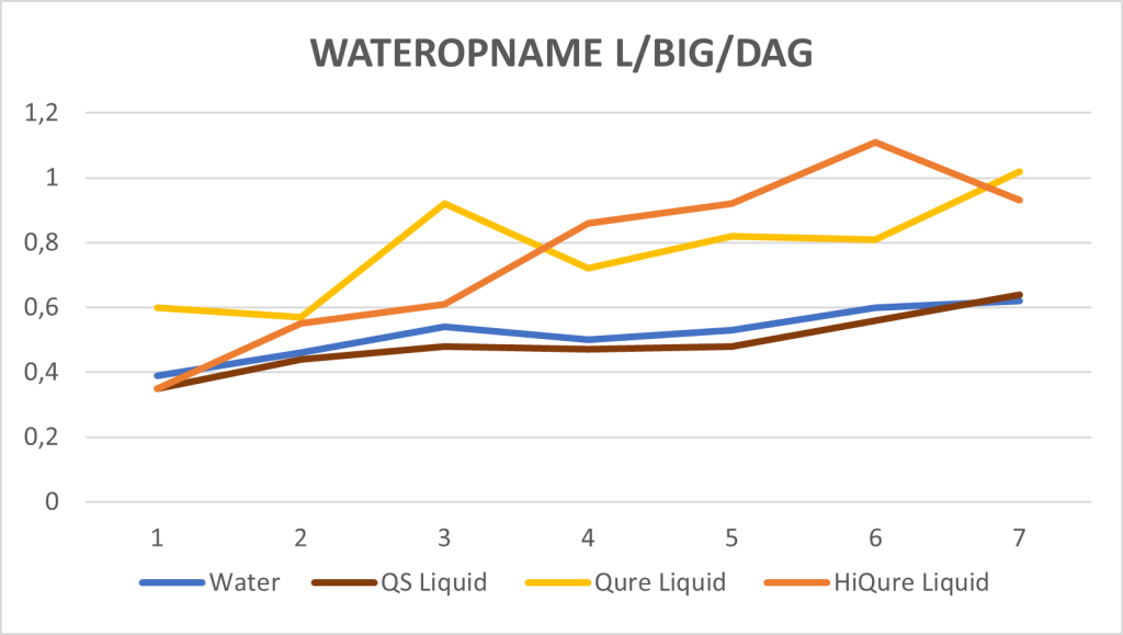 Grafiek 1: wateropname in dagen na spenen bij verschillende onderzoeksgroepen