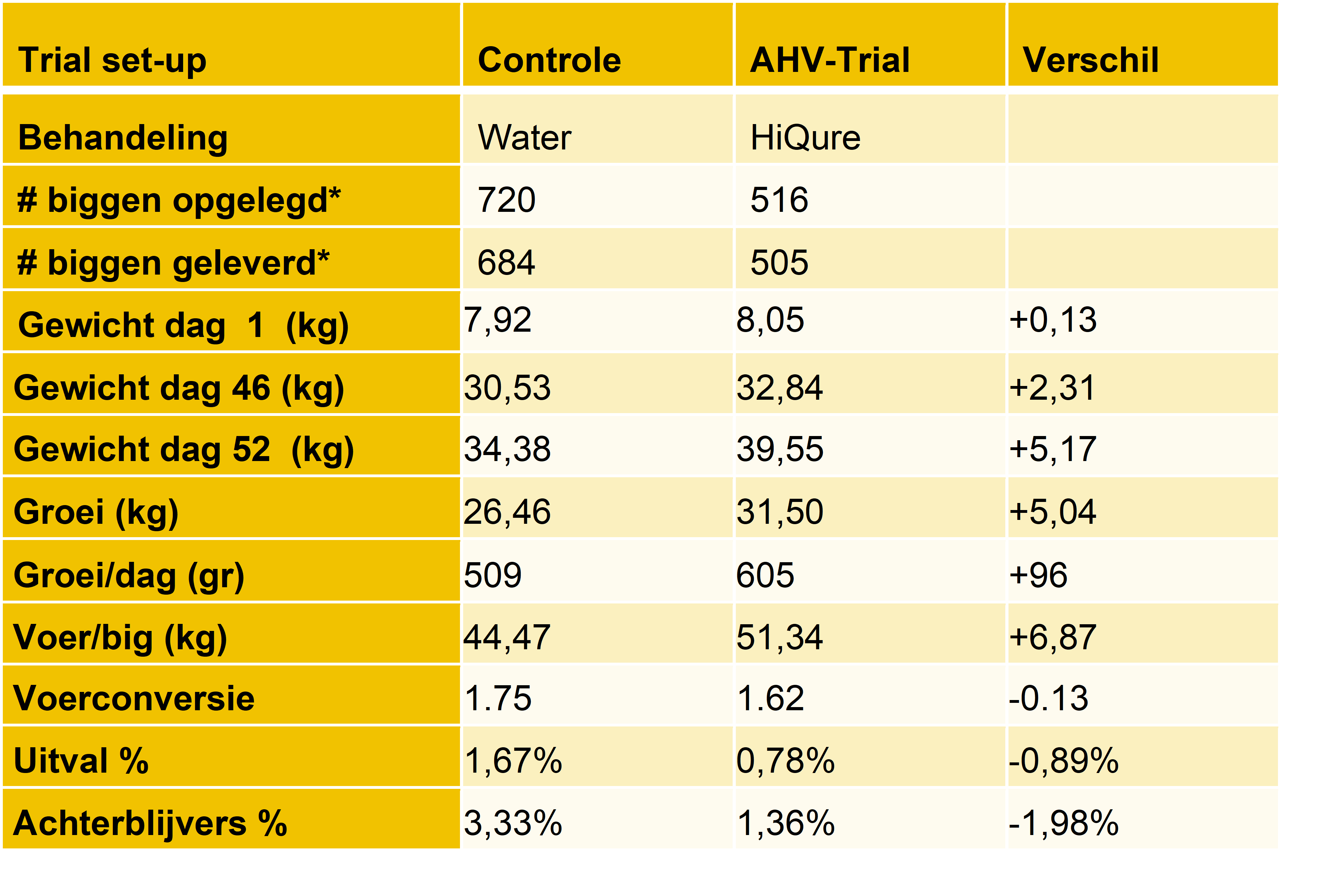 Tabel 3. Resultaten overzicht tussen controle, AHV-trial groep en verschillen. *Gespeend op de leeftijd van 28 dagen, uit op dag 52 na plaatsing in de biggenstal.