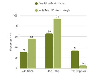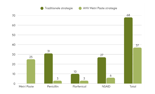 Er werd na de 48 uur beoordeling getoetst of zeugen een aanvullende behandeling nodig hadden om te herstellen. Dat aantal zeugen kreeg de titel “geen reactie op applicatie” en bleef bij de Metri Paste beperkt tot slechts 6%. Zij kregen aanvullend een antibiotica met pijnstiller. Alles samen resulteerde dit in 1,7 handelingen bij de traditionele bedrijfsstrategie en 1,3 handelingen bij de Metri Paste strategie, waarbij 94% minder antibiotica ingezet werd.