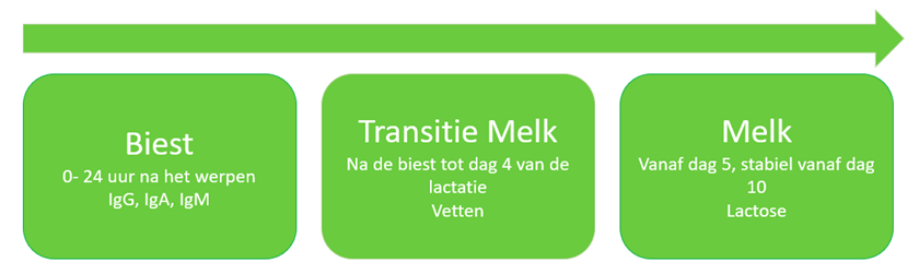 Biest en melk verschillen in moment van secretie en in samenstelling. Biest is de eerste afscheiding van de melkklieren die grotendeels wordt gevormd vóór het werpen. Biest wordt gekenmerkt door hoge concentraties immunoglobulinen (Ig) in vergelijking met melk, terwijl melk rijk is aan vet en lactose (Decaluwé et al., 2014). Bovendien bevatten biest en melk verschillende bioactieve stoffen zoals groeifactoren (EGF, IGF) en enzymen (lipase, amylase), veel van deze componenten zijn belangrijk voor overleving en bevorderen gastro-intestinale ontwikkeling en opname van voedingsstoffen (Mei et al., 2006). De transitie van biest naar melk verandert geleidelijk in de loop van de tijd (zie afbeelding).