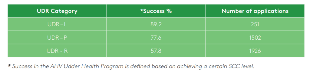 Results show that for a significant improvement the initial milk value is not important, ie the udder category is more important as this reflects how much biofilm is in the udder, compared to last HT milk values. On average, almost 85% (see table) of the cows that were recommended (UDR – L & P) for AHV udder boluses (Quick, Extra and Aspi) show a positive result at the next HT. For the youngest animals we even see a positive result in 9 out of 10 cows. In Holland, HTs are done monthly.