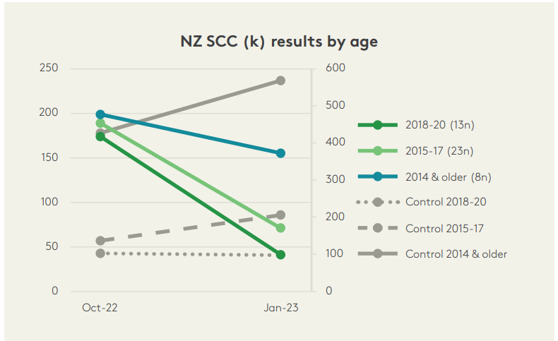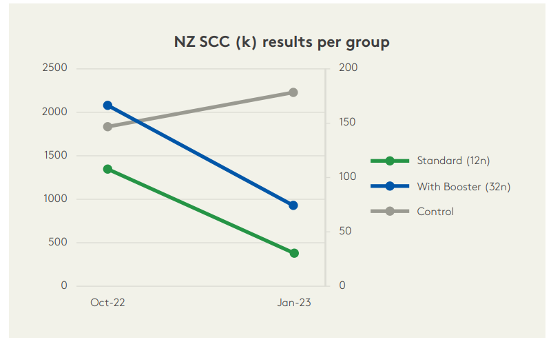AHV has been active in New Zealand since 2022 and over 300 dairy farms are using the AHV solutions. The below graph demonstrates the results of a South Island dairy farm were 44 NZ dairy cows of different ages and estimated amounts of biofilm in their udder (based on AHV’s udder health analysis) received AHV udder solutions. After the HT in October 2022, cows received an AHV Quick, Extra and Aspi Bolus, and 32 out of the 44 cows (with higher milk values) also received an AHV Booster Bolus, to fuel the immune system. ‘Control’ cows were matched on age and milk value at the HT of October 2022, where possible. Results at the next HT in January 2023 showed an overall milk value decrease of approximately 1M. Younger cows responded better than older cows, as expected and the Booster Bolus resulted in good results despite higher starting milk values. Control cows in the same period showed either same or higher milk values. In addition, cows receiving AHV udder solutions have better udder health for longer.