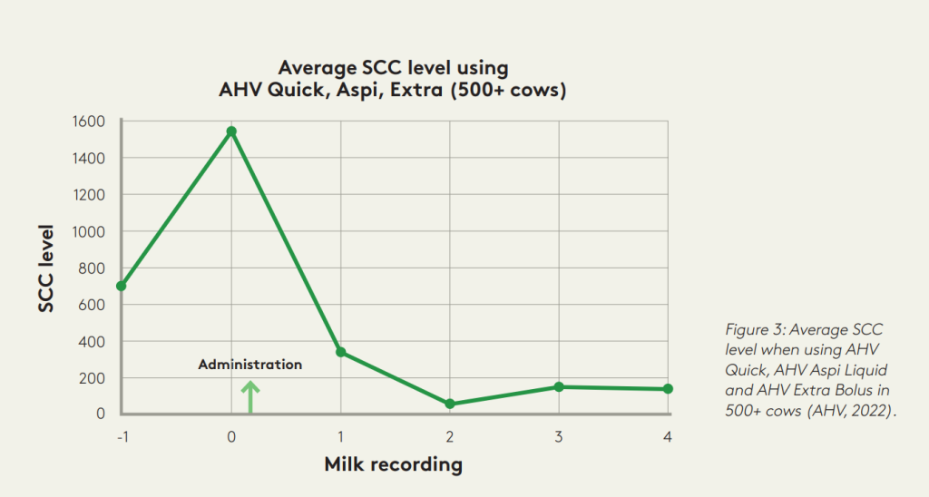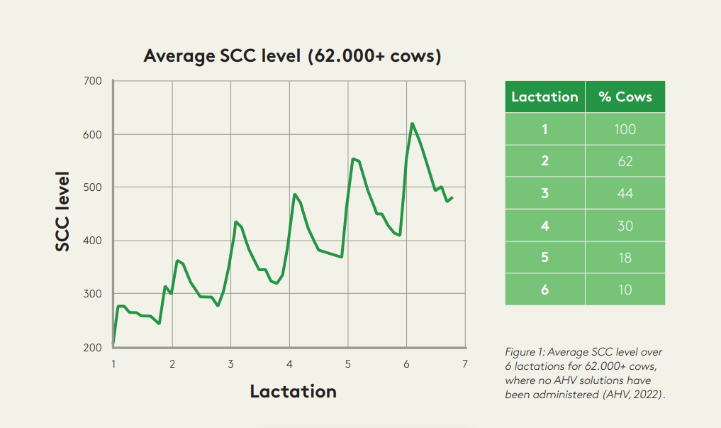 The above results demonstrate a positive influence on the direct animal health of your farm, as well as on lactations to come. Figure 3 shows that cows that have received AHV solutions show a clear improvement in udder health.