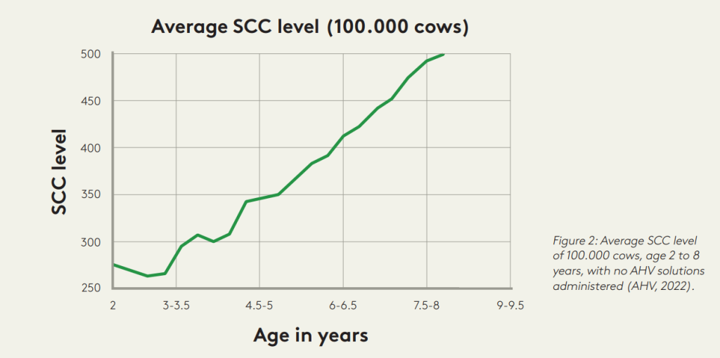 These future challenges are visible in Figure 2, which shows that the cow, by the use of regular methods and a good energy level among other things, gets through the first 2/3 years with a lower milk value. However, the data shows that from the third year of life onwards, challenges arise regarding udder health. Because bacteria have been waiting for their chance, they can come out of the biofilm and strike. This has a strong impact on the cow’s longevity, as can be seen in the table next to Figure 1.