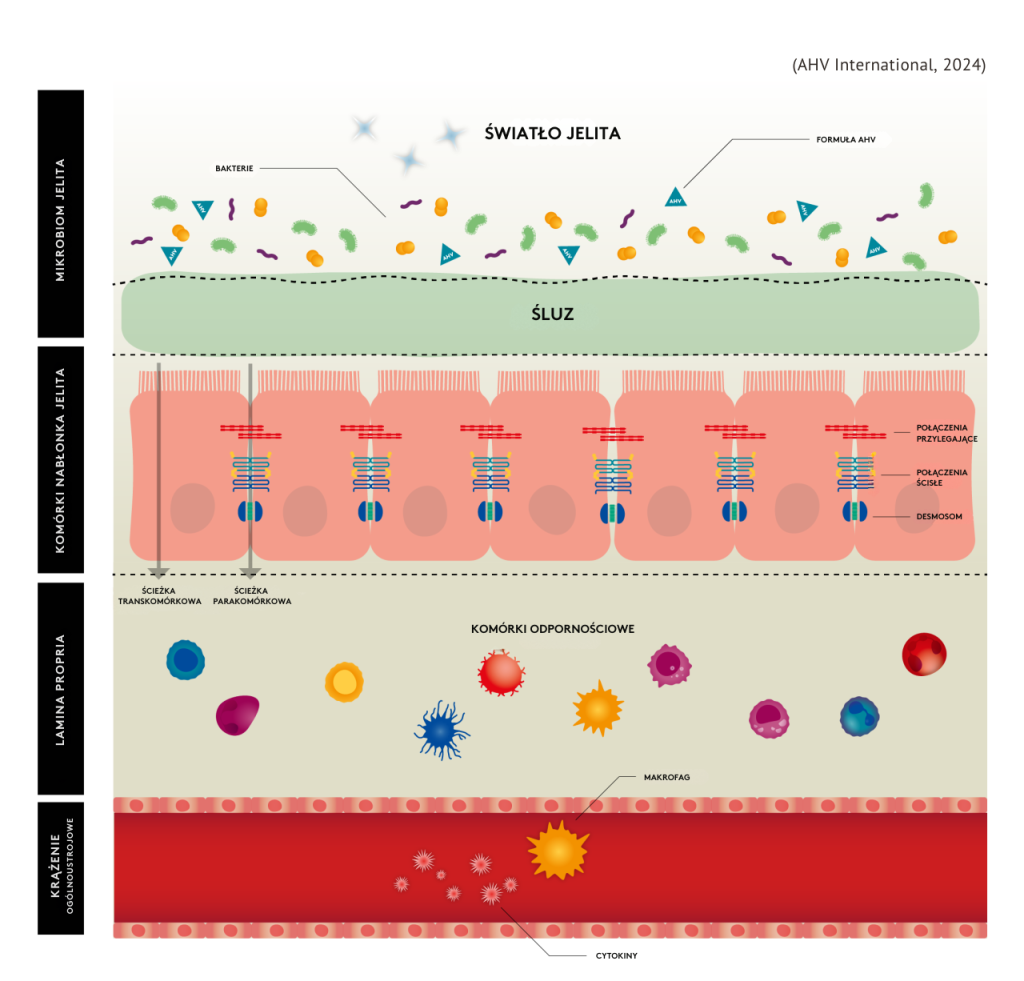 Rys. 4:  Wizualizacja przekroju przewodu pokarmowego, od światła jelita w kierunku wnętrza ciała. Technologia AHV działa zarówno przez wykrywanie kworum bakterii w świetle jelita, jak i na wzmocnienie układu odpornościowego.