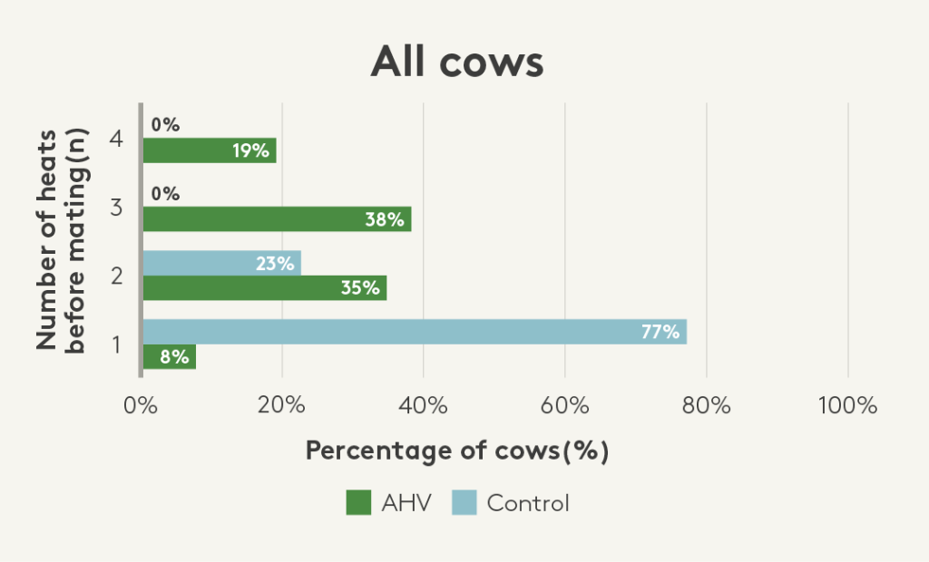 Această turmă a început reproducția pe 11 octombrie. 85/109 (78%) din vacile AHV au rămas gestante în primele două săptămâni, comparativ cu 52/102 (51%) din vacile martor. Acest lucru se reflectă într-o producție de lapte crescută în această lactație și un tipar de fătare mai compact în sezonul următor.