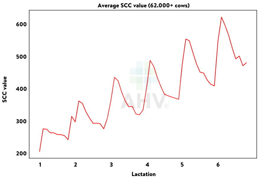 O vacă care nu primește soluții AHV prezintă adesea urcușuri și coborâșuri în numărul de celule somatice (SCC), în funcție de rezistența acesteia. Figura 1 arată evoluția valorii medii SCC pe baza datelor de la peste 62.000 de vaci (categoria UDR-L, UDR-P, UDR-R), unde nu au fost utilizate soluții AHV (AHV, 2022). Această cifră arată că susținerea timpurie a ugerului este esențială pentru a evita provocările viitoare.