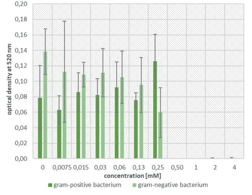 Z MBIC merimo vrednost minimalne koncentracije, ki je potrebna za preprečevanje nastanka biofilma. To smo preizkusili v našem laboratoriju z našimi AHV – QQ komponentami (slika 1). Biofilm je pogosto sestavljen iz večih vrst bakterij. Ena prednost je, da je naša QQ komponenta učinkovita proti biofilmu gram-pozitivnih in gram-negativnih bakterij.
