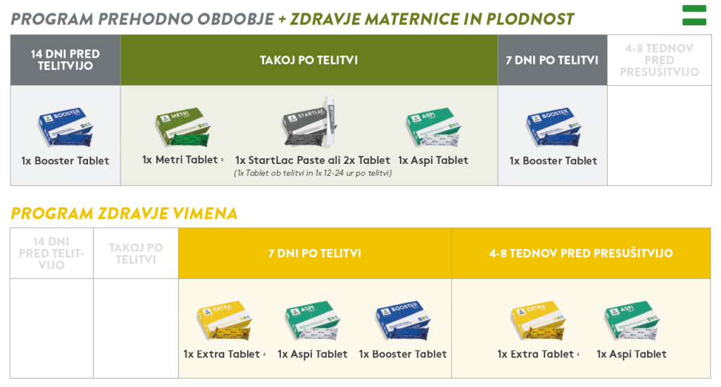 Pri AHV verjamemo, da je najboljši pristop proaktivna podpora živalim v različnih fazah življenjskega ciklusa. V skladu s tem priporočamo proaktivno aplikacijo Booster Tablet 14 dni pred telitvijo in 7 dni po telitvi. Ta metoda aplikacije bo med drugim podprla zdravje maternice, plodnost in zdravje vimena. AHV Booster Tablet poskrbi, da krava začne in vzdržuje z žretjem krme, optimizira energijsko bilanco in aktivira presnovo (jetra in vamp) krave.
