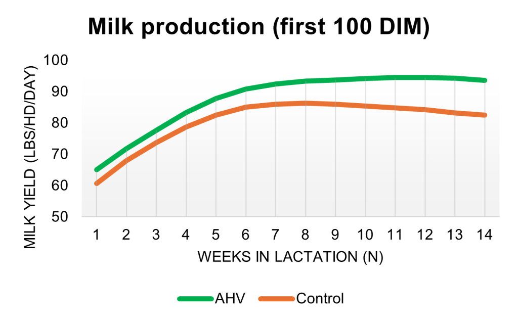 • Milk Production: Increased by 3 kg/head/day during the first 100 days in milk (DIM)